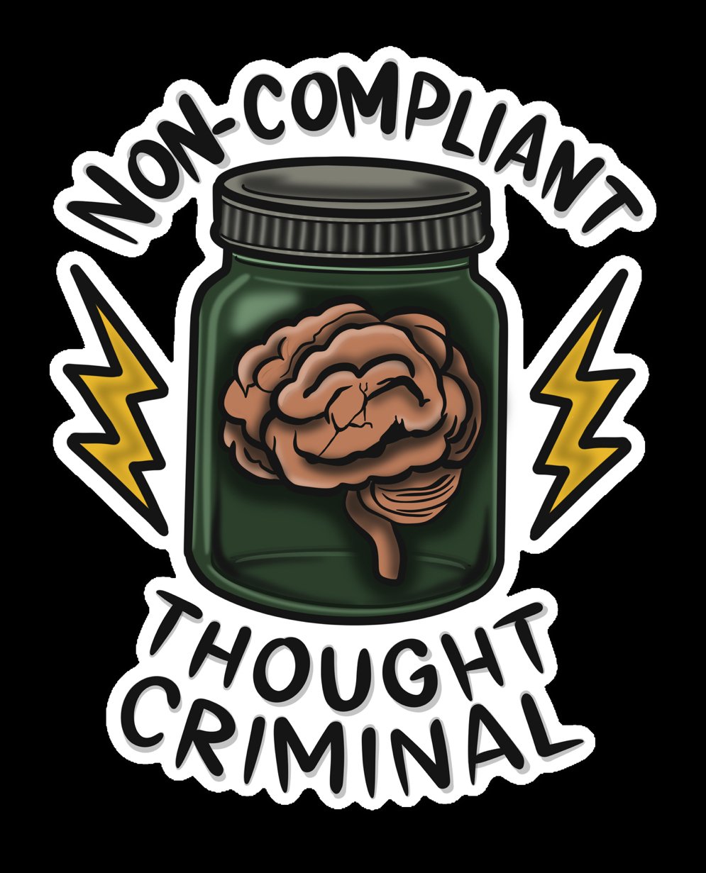 A perfect little badge of dishonor for anyone whose brain refuses to stay inside the lines. This vinyl sticker features a jarred, rebellious brain radiating chaotic energy and proudly declaring “NON-COMPLIANT THOUGHT CRIMINAL.”