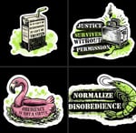 Each sticker features bold, high-contrast artwork in signature Drawn Dissent style: heavy black linework, distressed textures, and acid green accents that hit from across the room. These are made to be seen.