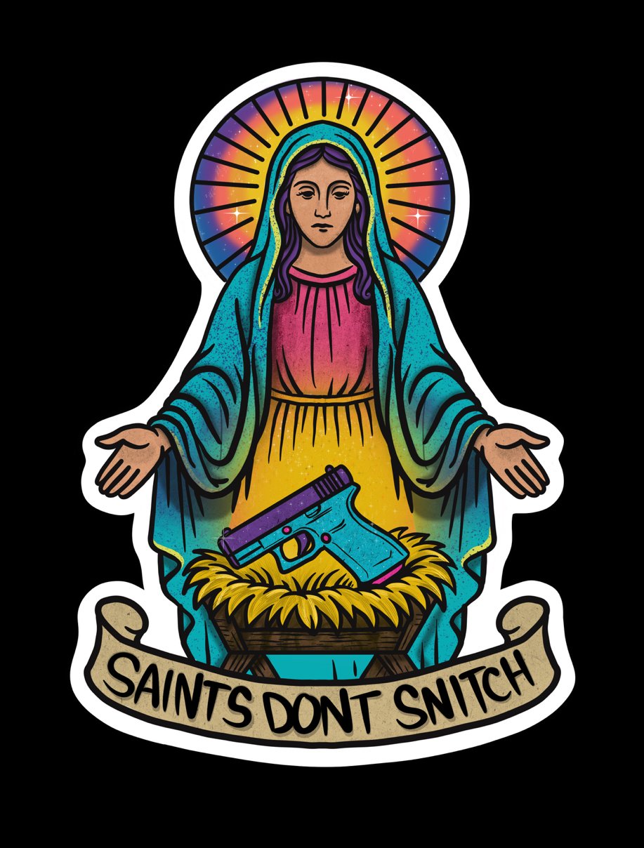 Holy irreverence, Batman. This vinyl sticker blends sacred iconography with chaotic street-level attitude. A radiant saint watching over a very unexpected offering: a brightly colored handgun cradled in a manger, crowned by the banner “Saints Don’t Snitch.”