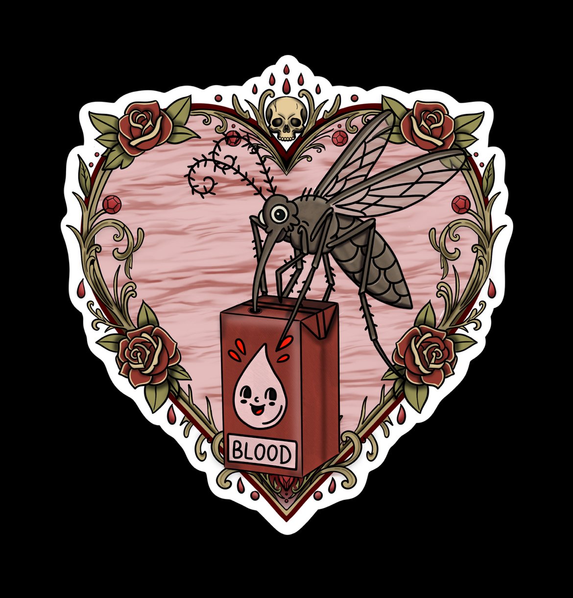 A little gothic, a little gross, and weirdly adorable, this sticker celebrates the world’s tiniest drama queen: the mosquito. Wrapped in an ornate heart of roses, skulls, and dripping details, our thirsty little menace sips daintily from a smiling blood carton like it’s a vintage juice box.