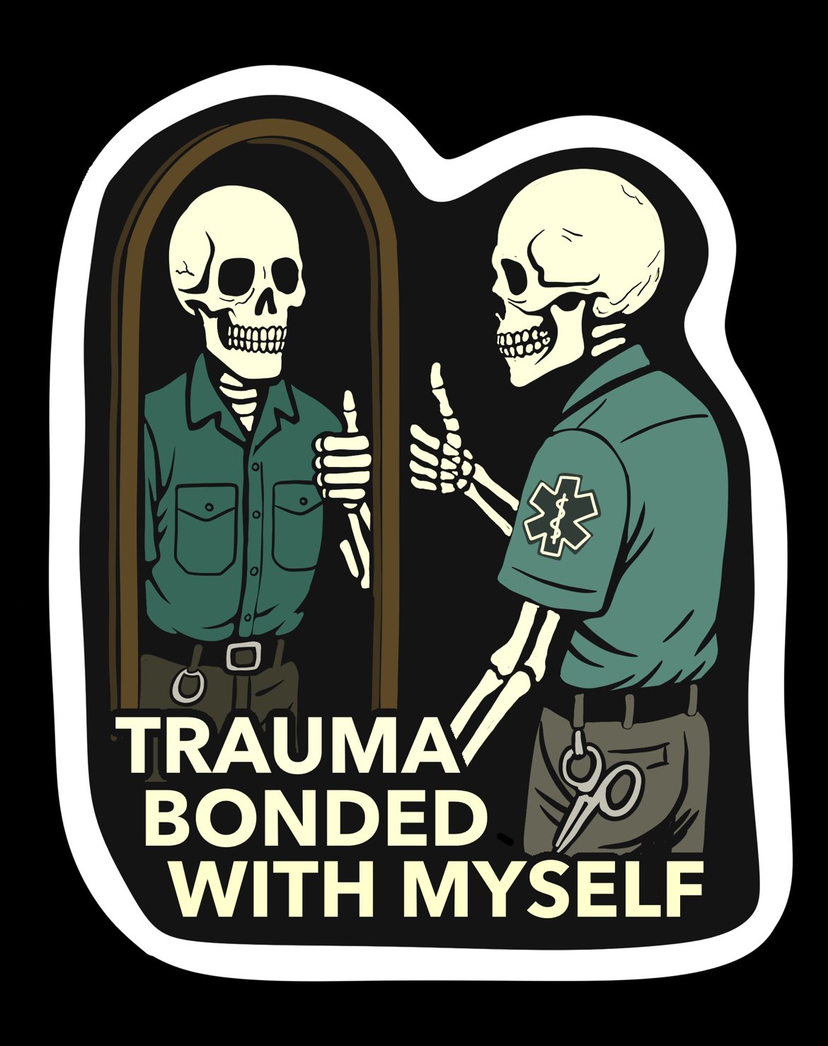 This premium vinyl sticker features a skeletal medic giving their mirror self the classic “we’re fine, everything’s fine” thumbs-up, a perfect tribute to coping mechanisms that are definitely not in the textbook but absolutely EMS-approved.