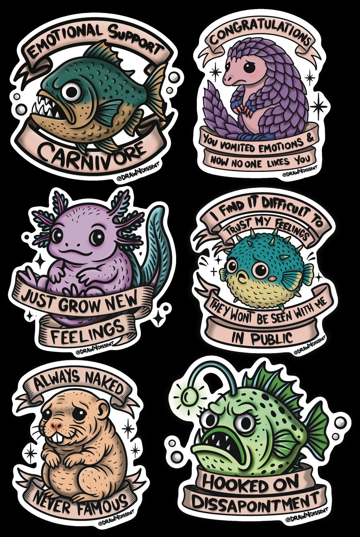 Welcome to the most chaotic zoo your emotions have ever seen. The Unstable Environment sticker set features six critters who are just trying their best—badly, dramatically, and with absolutely zero coping mechanisms.